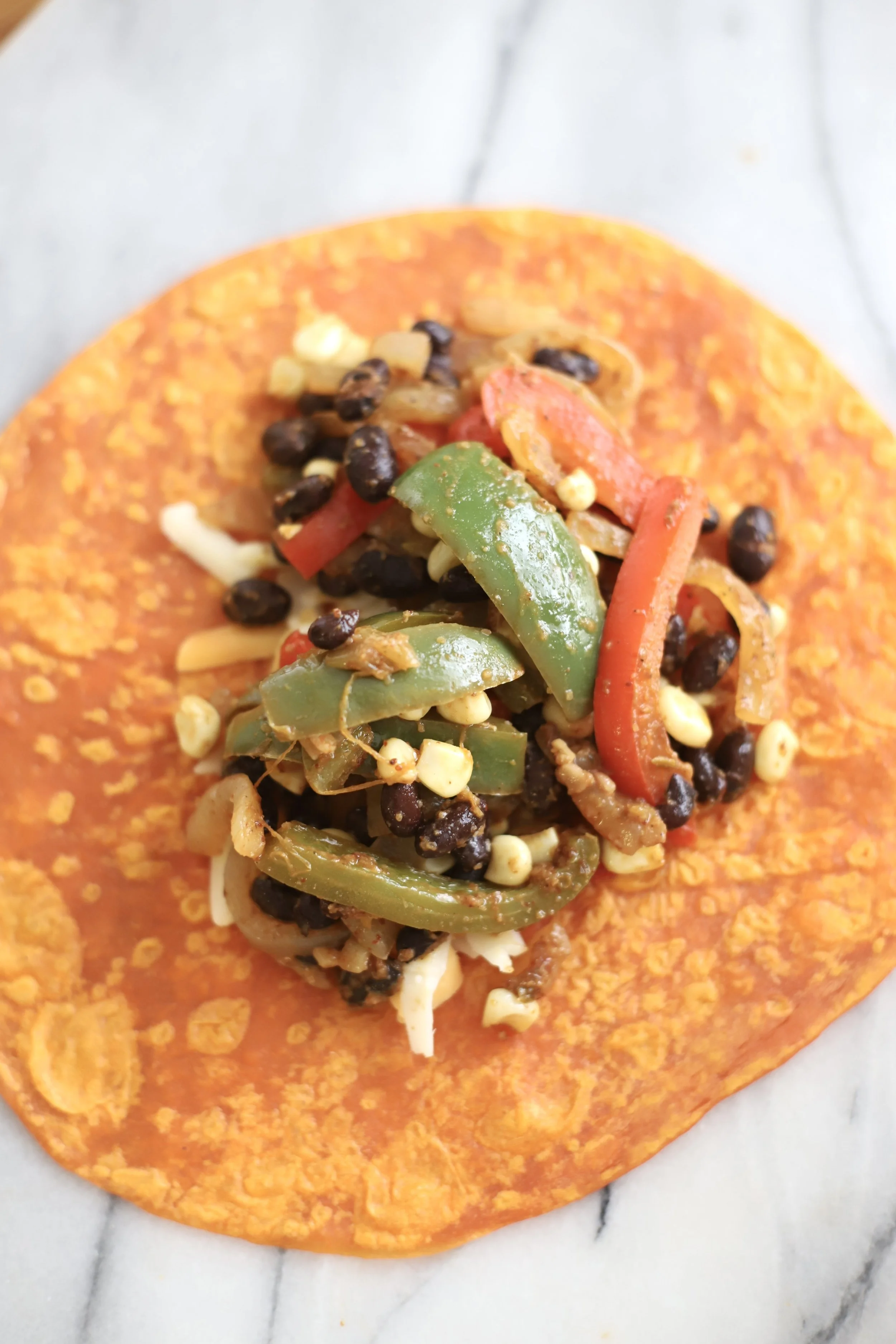 Second, you’ll start the assembly! Simply take a tortilla, sprinkle it with a little water, and warm it in the microwave for 10 seconds, then fill the tortilla with 1/2 cup or so of the bean and veggie mixture. Sprinkle it with a little cheese, and then roll as tightly as possible. I like to hold the burrito down so that the edges connect together. With a warmed tortilla sprinkled with water, it should stick together just fine. If for some reason your burrito will not stay together, then I suggest sticking it with a toothpick so it stays connected.