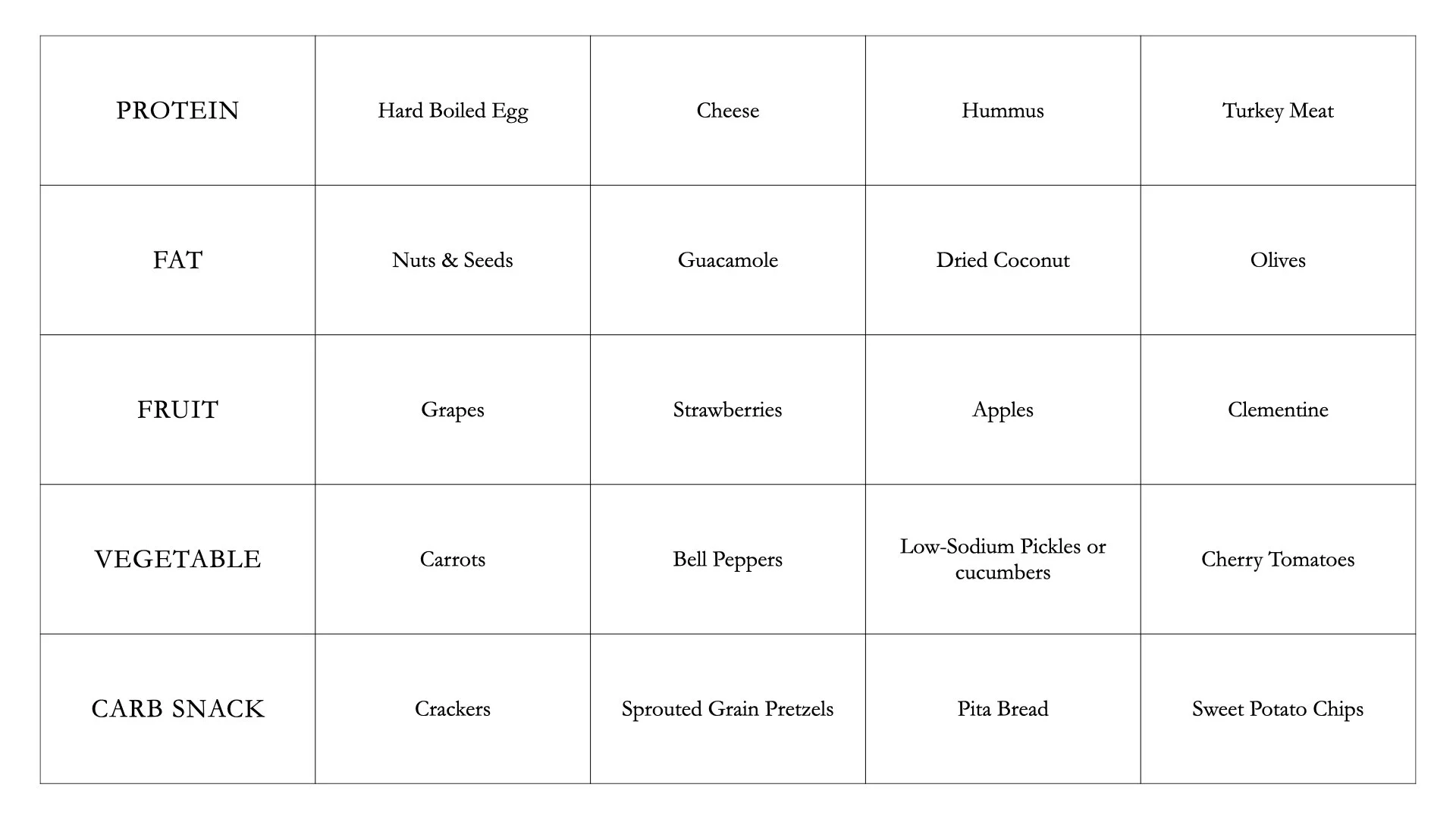 First, choose a protein, fat, vegetable, fruit, and a carb snack. This ensures that you will get enough nutrients AND have a balanced lunch. Protein keeps you full for longer, fats are vital for brain function, fruits and vegetables give you fiber, and whole grains give you vitamins.